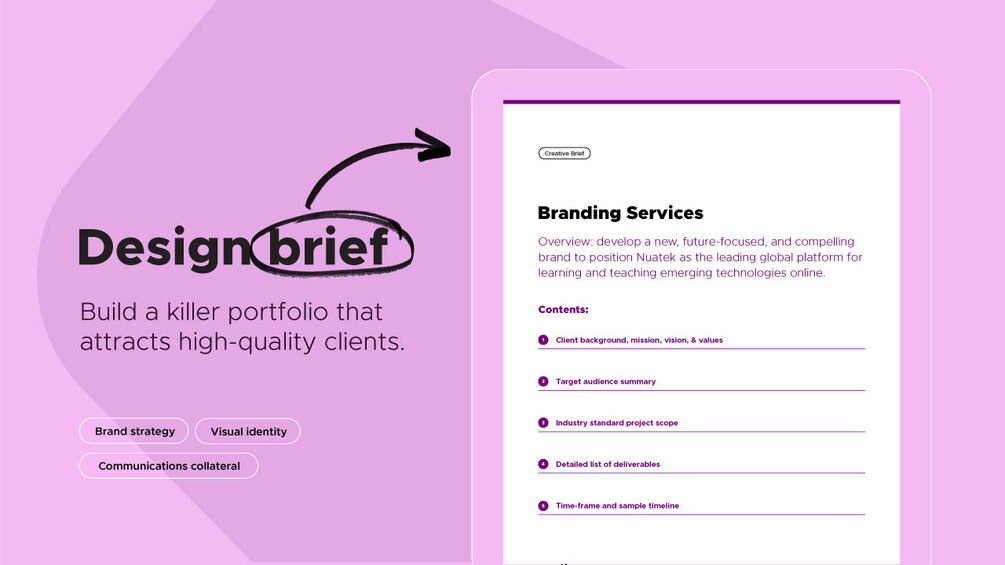 Say hello to our high-quality practice design briefs—detailed, inspiring, and industry standard. If you're self taught or studied online, your practice projects likely don't have the rigor and depth that emulate the real client work that freelancers have to deal with on a daily basis. Our briefs are modeled after real work with real clients.